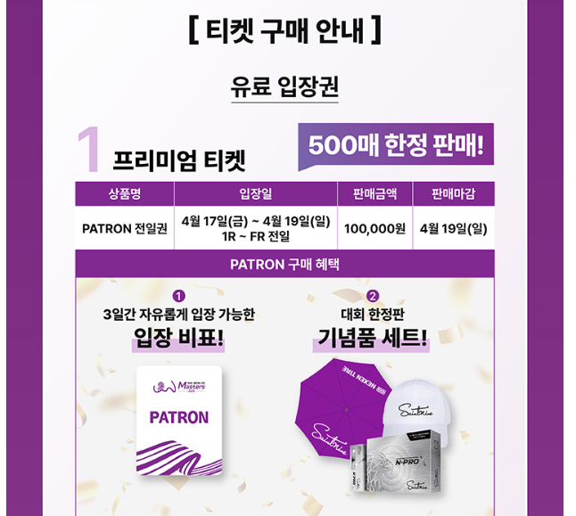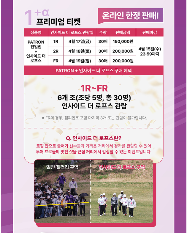 오늘 마감인데 PATRON 전일권에 라운드별로 인사이드 더 로프스로 로프 안에서 경기를 관람할수 있는 티켓입니다.