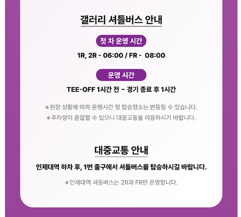 셔틀버스 운영 시간은 1R, 2R은 6시부터, FR은 8시부터이며, 경기 종료 후 1시간까지 운행합니다.
