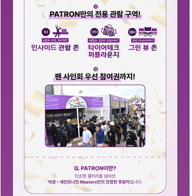 단순한 갤러리를 넘어 넥센. 세인트나인 Masters의 후원자인 PATRON만을 위한 전용 관람 구역인 인사이드 관람존, 타이어테크 퍼플 라운지, 그린 뷰 존을 이용 가능합니다.