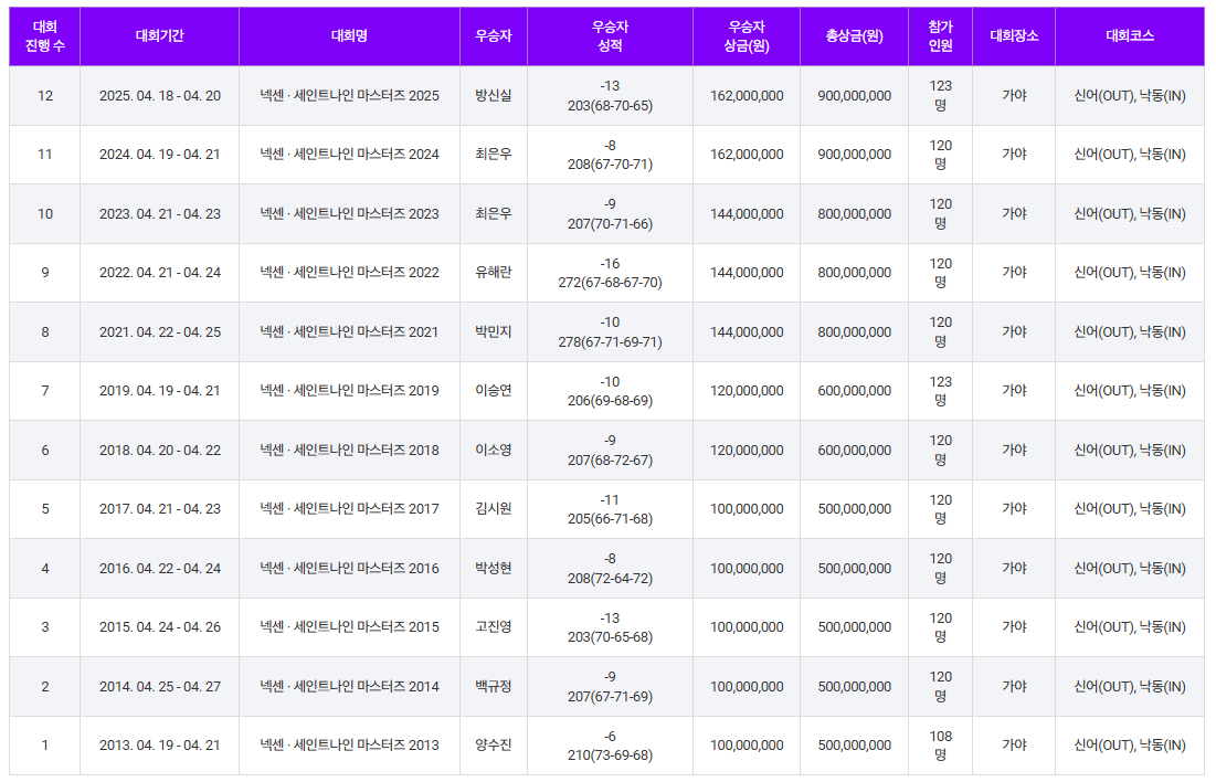 12년 연속 가야 CC에서 개최되고 있고, 총 상금은 전년도 9억원에서 10억원으로 우승 상금은 전년도 1.62억원에서 1.8억원으로 증가하였습니다.