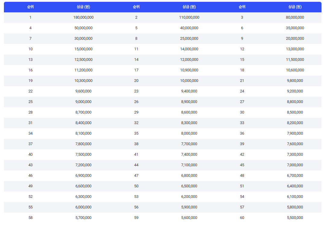 우승자는 1억 8천만원, 최저 상금 550만원 입니다.