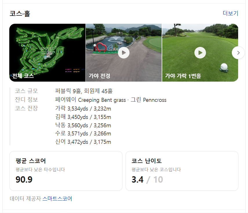 가야컨트리클럽은 스마트스코어 기준 평균스코어 90.9타, 코스 난이도 3.4점으로 평균보다 쉬운 곳입니다.