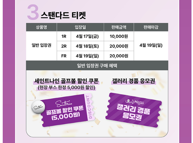 이번 넥센. 세인트나인 Masters 2026의 갤러리티켓은 총 4가지 종류로 구성되어 있습니다.