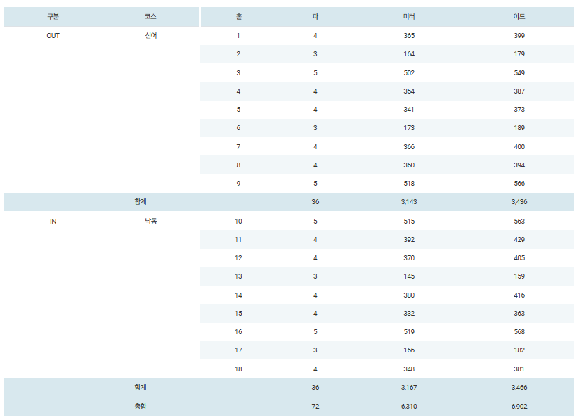 경기코스는 산어 코스와 밸리 코스인데, 총 전장은 6,310 미터, 6,902 야드 입니다.