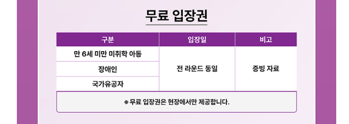 무료 입장권은 만 6세 미만 취학 아동, 장애인 및 국가유공자에 해당합니다.