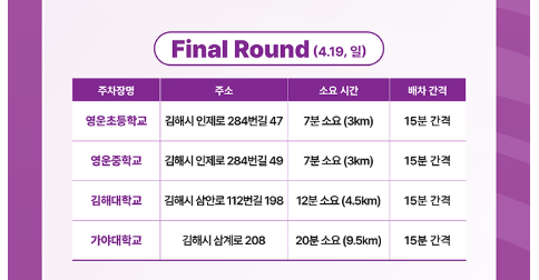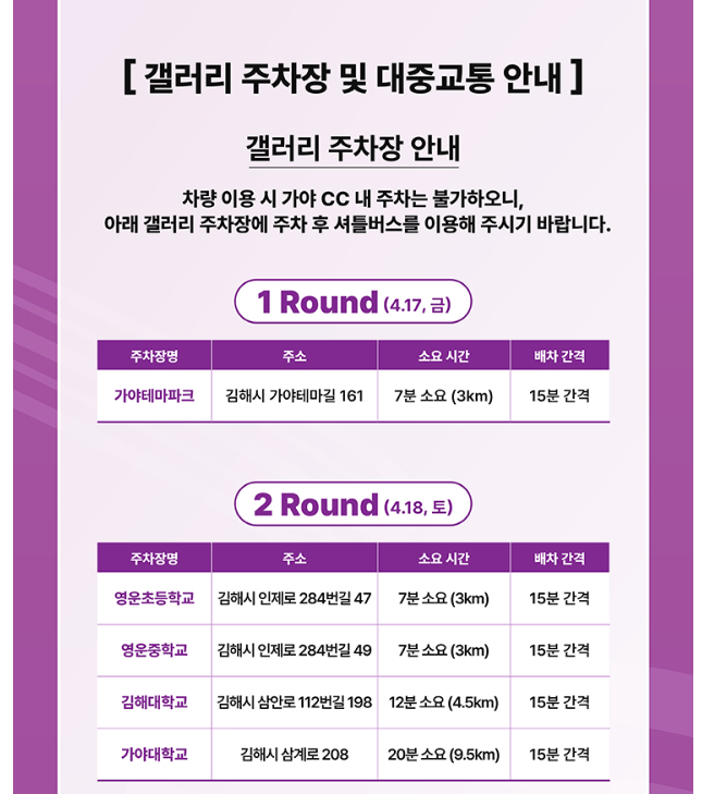 갤러리 주차장은 1 Round는 가야테마파크이며, 2 Round와 Final Round는 4개의 주차장이 운영됩니다.