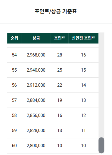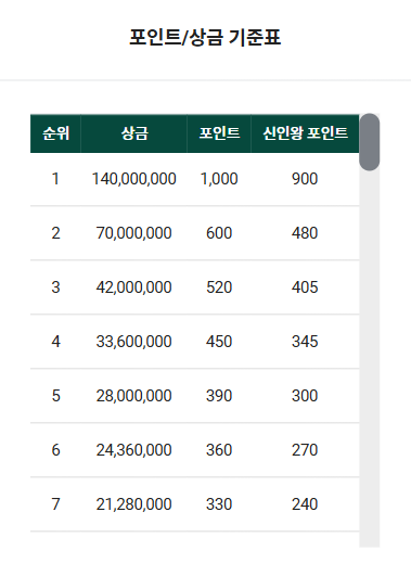 우승자는 1억 4천만원, 최저 상금 280만원 입니다.