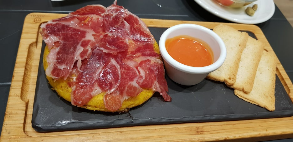 하몽아래에 있는 음식이 또르띠야 데 파타타입니다.