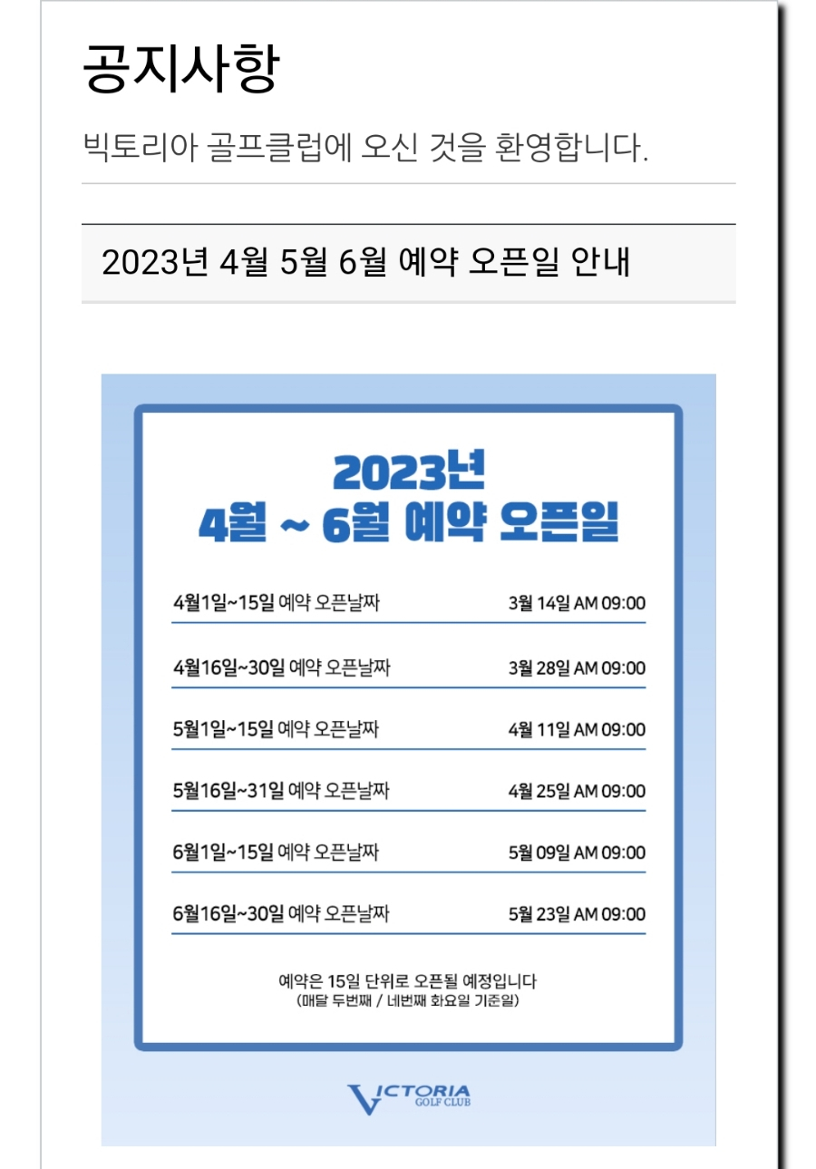 빅토리아 골프클럽은 매일 예약 오픈이 안되고, 2주에 한번 몰아서 오픈되는 시스템 입니다.
