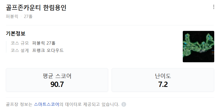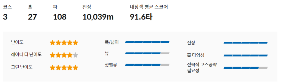총 27홀로 구성된 퍼블릭 골프장으로, 네이버에 검색해보면 평균 스코어 90.7, 난이도 7.2로 무난한 편 입니다.