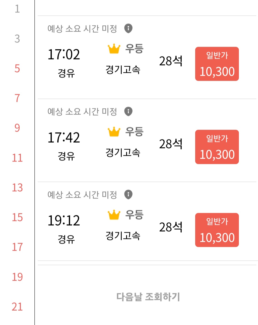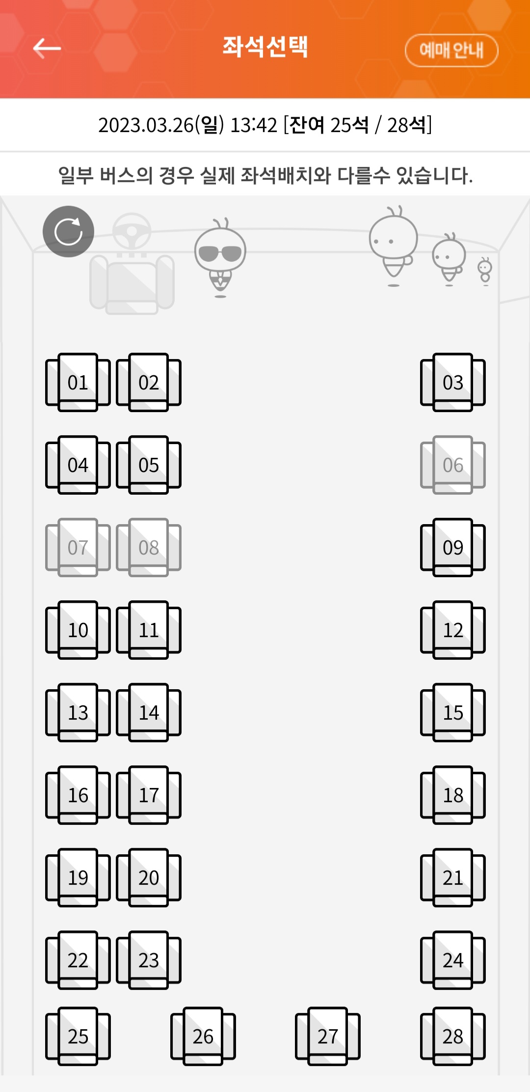 모두 우등버스로 운행되어 총 28좌석이 있네요.