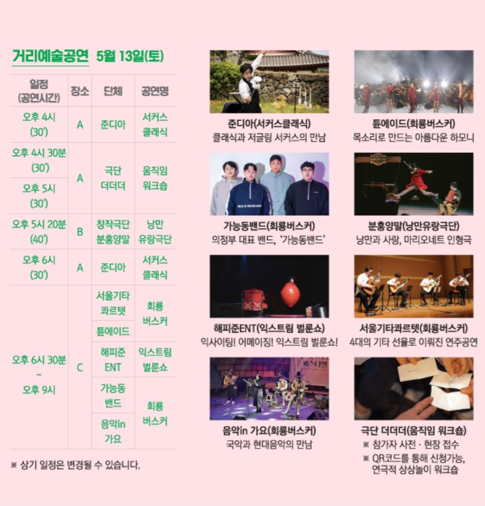 5월 13일 토요일 일정표인데, 서커스 클래식, 움직임 워크숍, 낭만 유랑극단, 회룡 버스커, 익스트림 벌룬쇼 등 다양한 공연이 준비되어 있습니다.