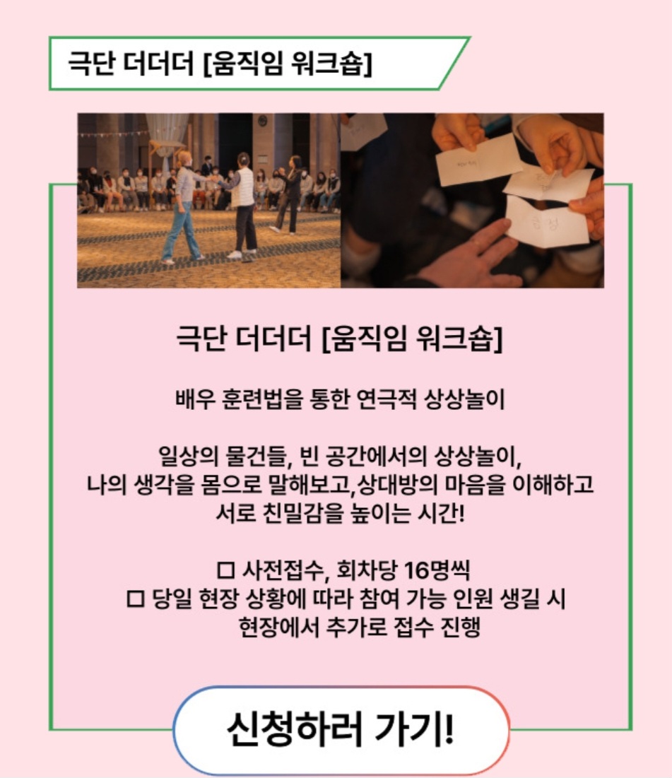 마지막으로 극단 더더더 의 움직임 워크숍 사전예매하는 링크가 있습니다.