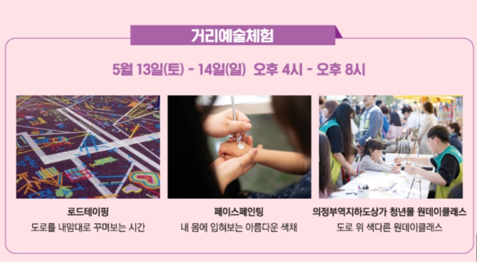 거리예술체험으로는 로드테이핑, 페이스페인팅 및 의정부역지하도상가 청년들 원데이클래스 등 아기가 좋아할만한 것도 있어보이네요.
