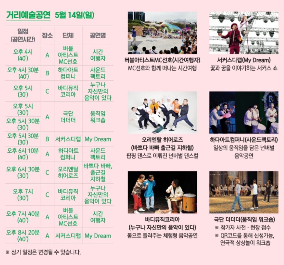 5월 14일 공연으로는 시간여행자, 사운드 팩토리, 움직임 워크샵, 음악공연, 댄스컬 등 다른 공연들이 많습니다.