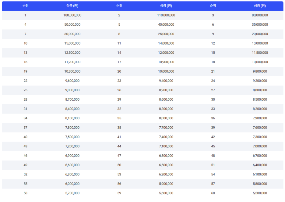 총 60명의 선수가 상금을 받습니다. 우승자는 1억 8천만원, 최저 상금 550만원 입니다.
