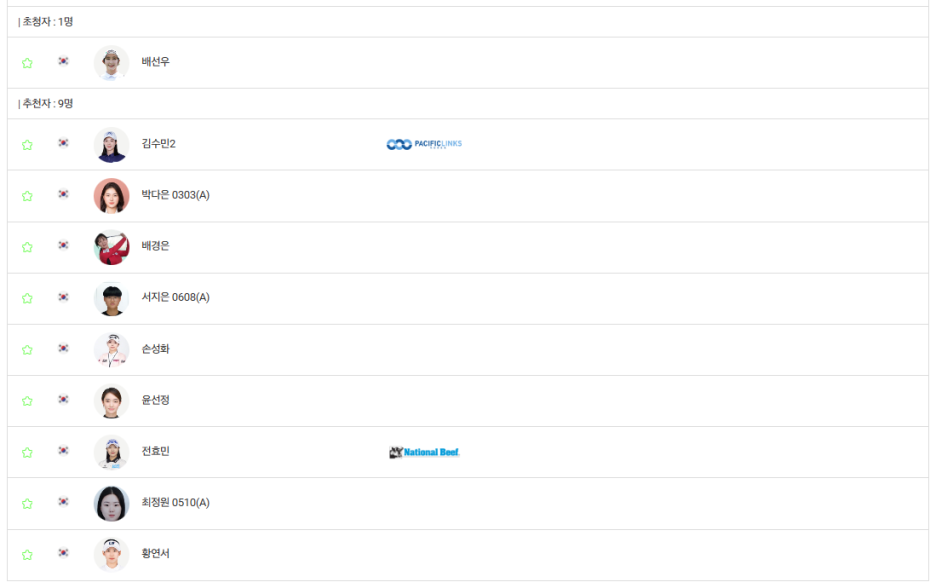 초청자는 배선우, 추천자로는 배경은, 황연서 선수 등 총 9명 입니다.