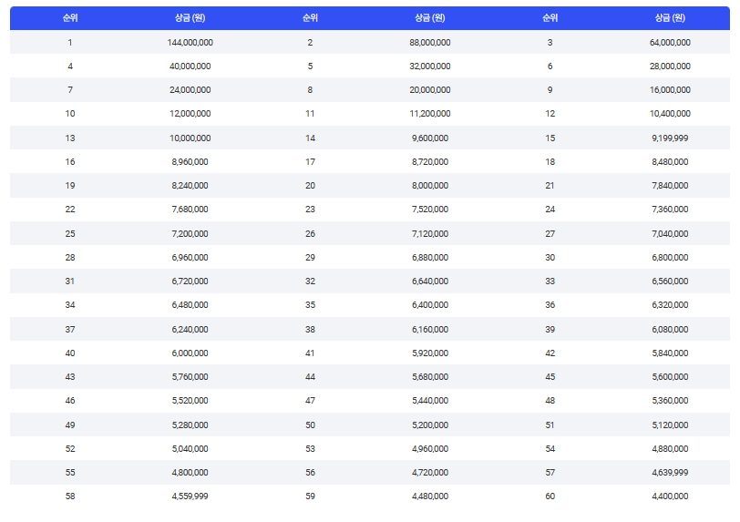 총 120명의 선수 중 60명의 선수가 상금을 받습니다. 우승자는 1억 4천 4백만원, 최저 상금 440만원 입니다.