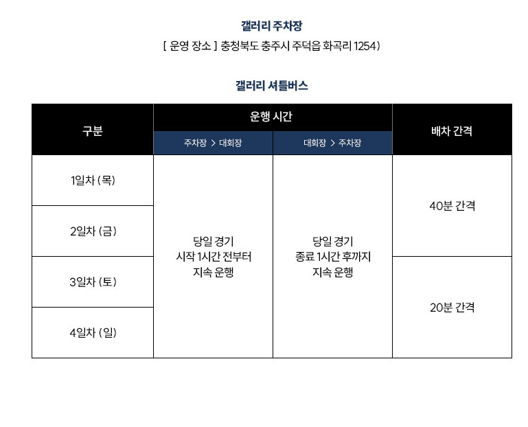 갤러리 셔틀버스는 당일 경기 시작 한시간전부터 주중에는 40분 간격, 주말에는 20분 간격이며, 대회장에서는 당일 경기 종료 1시간 후 까지 지속 운행 합니다.