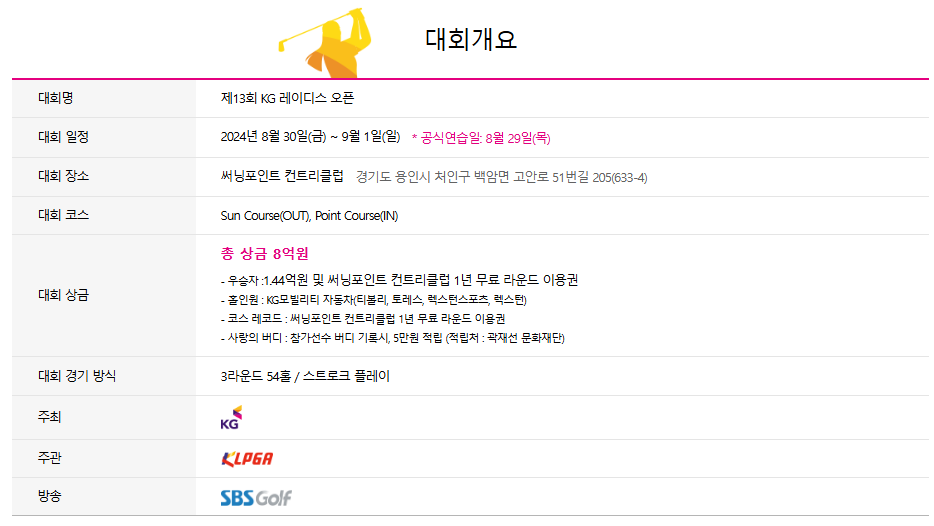 올해로 13회를 맞는 KG 레이디스 오픈은 2011년 이데일리 -KYJ골프 여자오픈으로 시작해서 이름이 계속 바뀌면서 장소도 바뀌면서 진행되었고, 2016년 6회대회부터 써닝포인트에서 진행하고 있습니다.