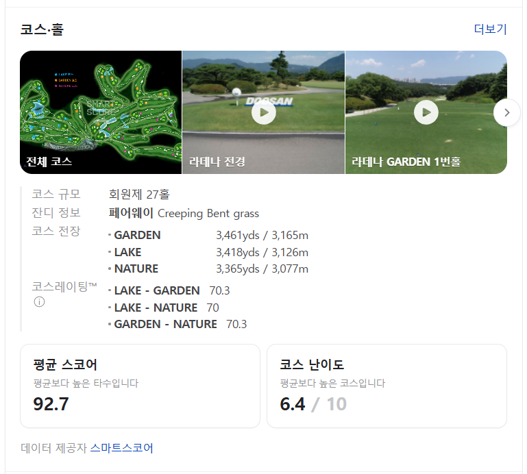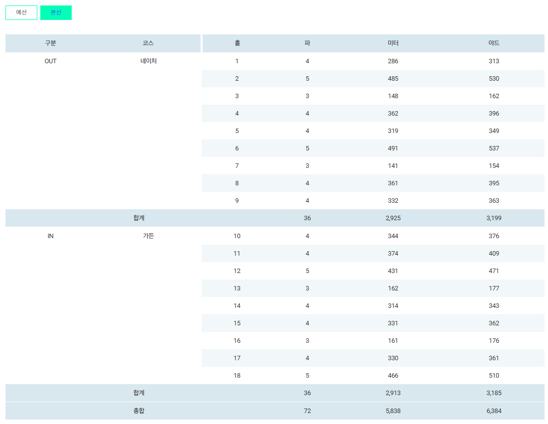 경기코스는 네이처 코스와 가든 코스인데, 총 전장은 5,838 미터, 6,384 야드 입니다.