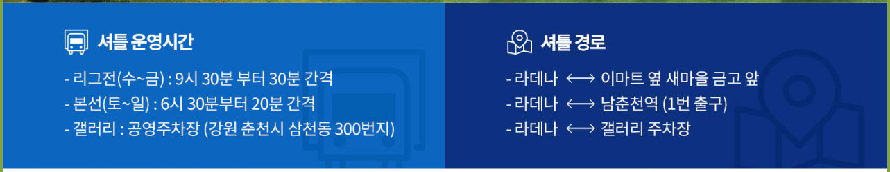 셔틀버스는 이마트 옆 새마을금고 / 남춘천역 1번출구 / 갤러리 주차장 총 3곳에서 운영됩니다.