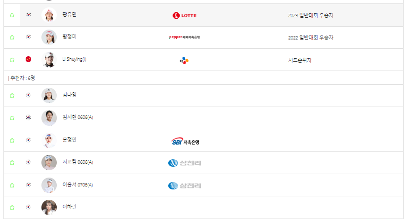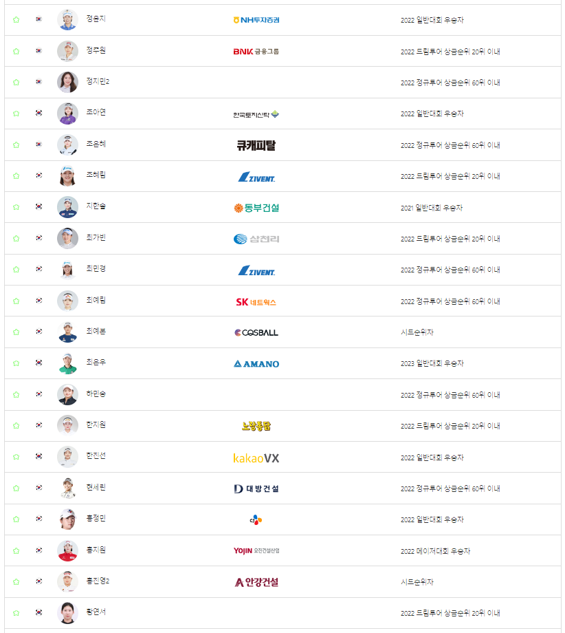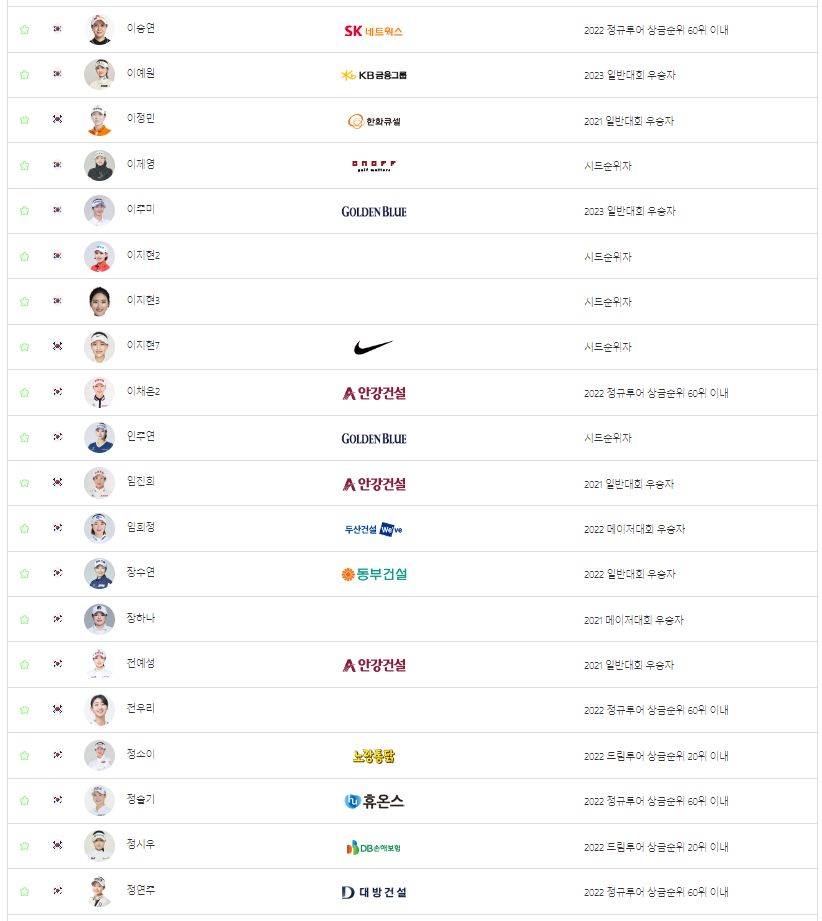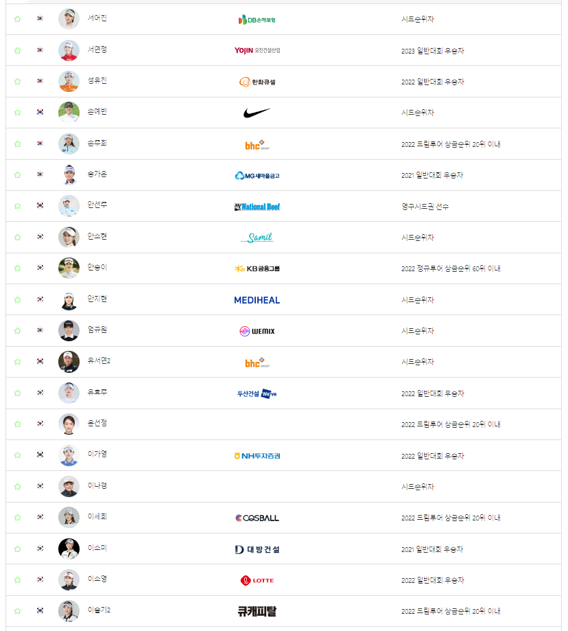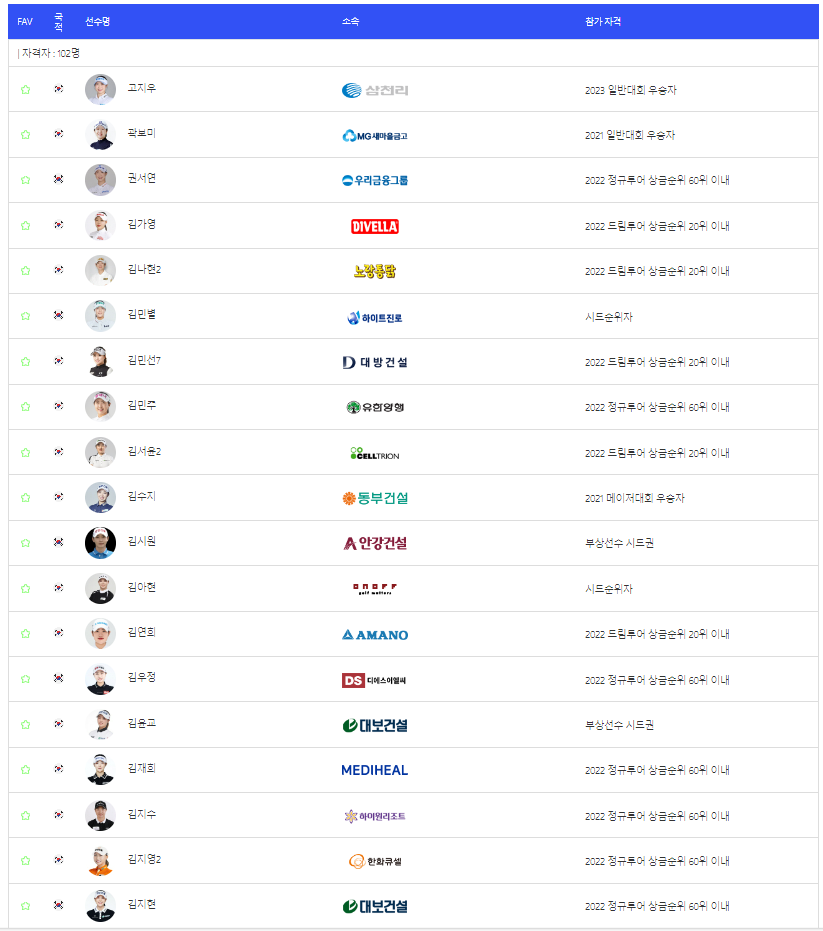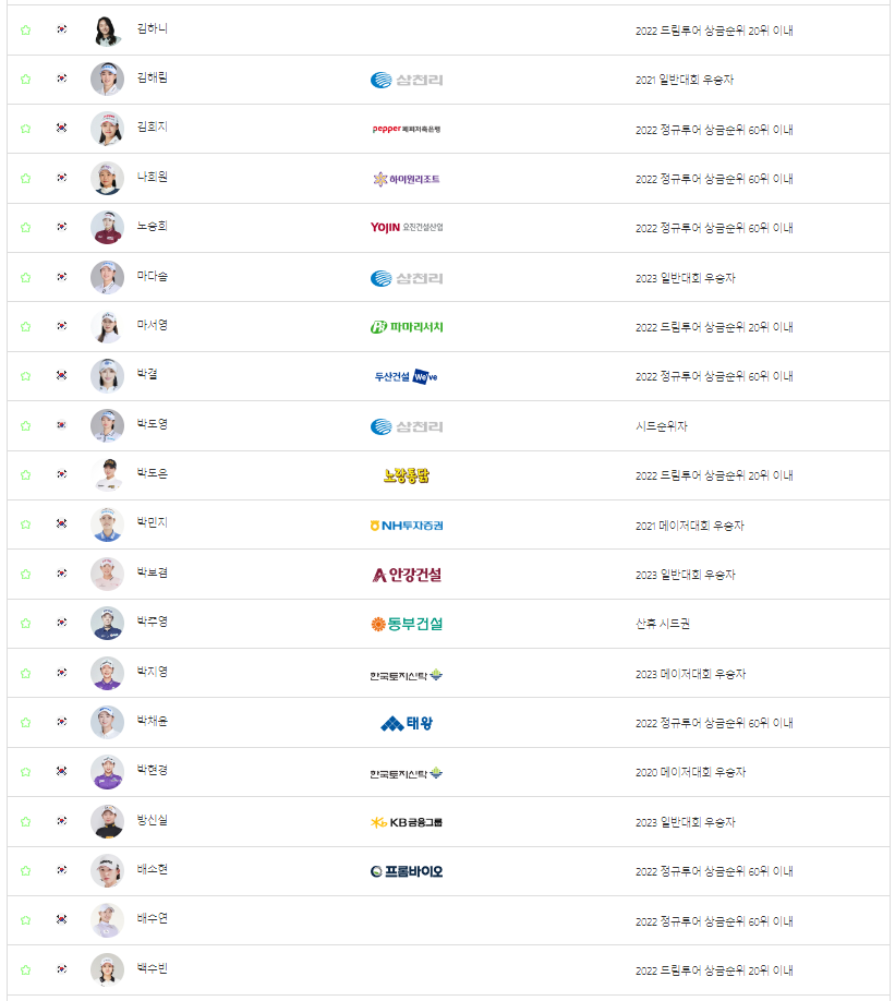 지난주 OK금융그룹 읏맨오픈 우승자인 마다솜 선수를 비롯해서, 박결, 박도영, 박민지, 박보겸, 박주영, 박현경, 방신실 선수가 참가합니다.