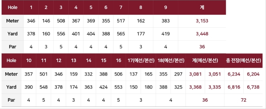 경기코스는 밸리코스와 서원코스인데, 총 전장은 본선 기준 6,204미터, 6,738 야드 입니다.