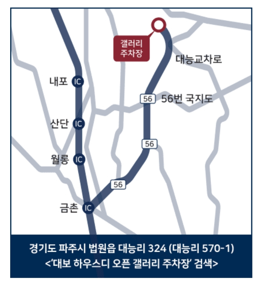 갤러리 주차장은 대보 하우스디 오픈 갤러리 주차장으로 검색하거나, 경기도 파주시 법원읍 대능리 324 (대능리 570-1)로 설정하면 됩니다.
