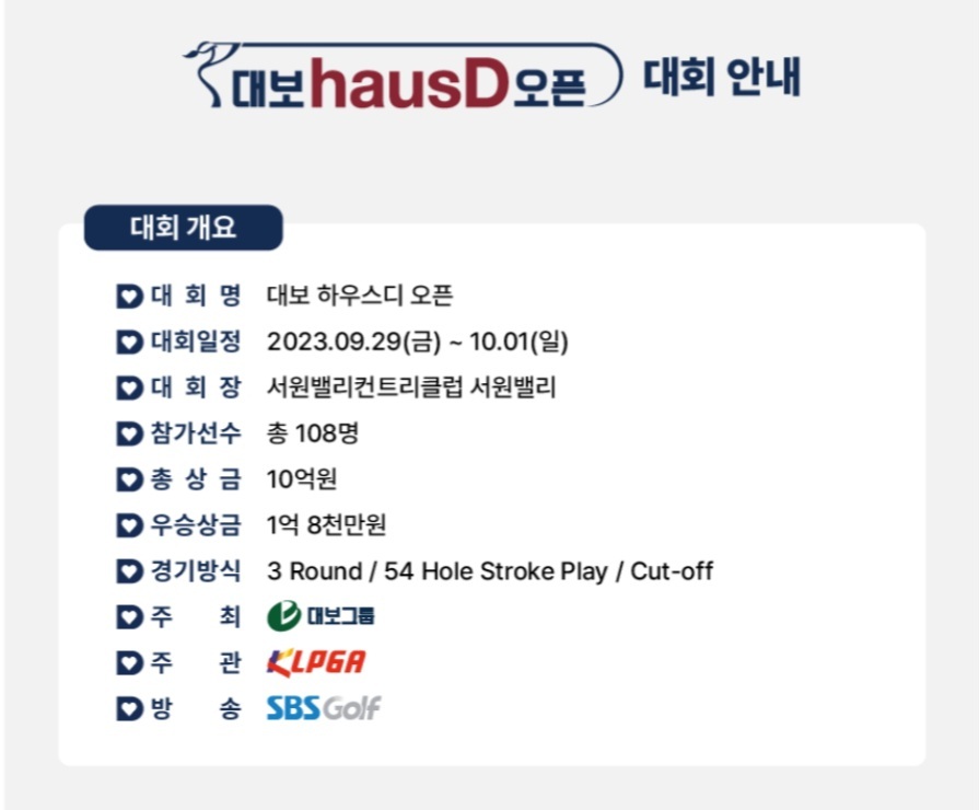 총상금 10억 원, 우승상금 1.8억 원에 달하는 제3회 대보 하우스디 오픈 KLPGA 골프 대회를 경기도 파주에 위치한 서원밸리컨트리클럽에서 2023년 9월 29일(금)부터 10월 1일(일)까지 개최됩니다.