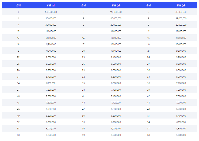 총 108명의 선수 중 60명의 선수가 상금을 받습니다. 우승자는 1억 8천만원, 최저 상금 550만원 입니다.