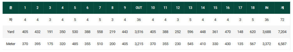 경기코스의 총 전장은 7,204 야드, 6,587 미터 입니다.