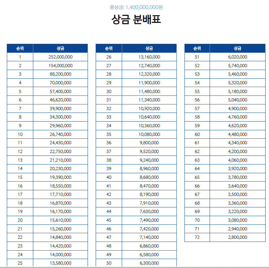 총 138명의 선수 중 72명의 선수가 상금을 받습니다. 우승자는 2억 5천 2백만원, 최저 상금 280만원 입니다.