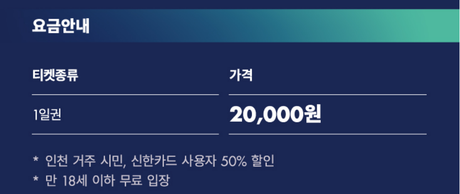 할인 받는 방법으로는 인천 거주 시민과 신한카드 사용자 50% 할인 입니다.