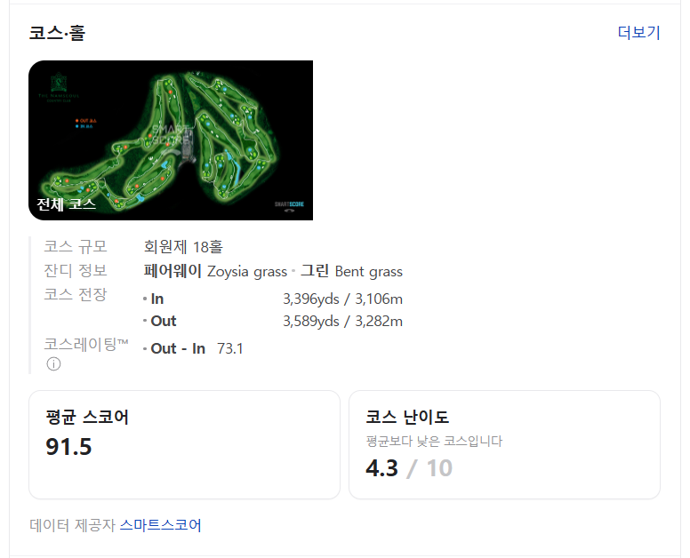 스마트스코어 기준 평균스코어는 91.5타, 코스 난이도는 4.3으로 평균보다 조금 낮은 코스 입니다.