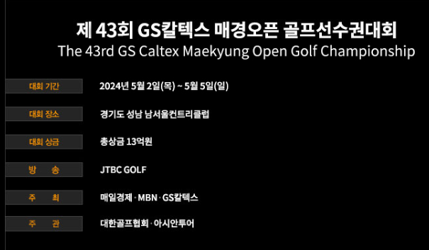 총상금 13억 원에 달하는 제43회 GS칼텍스 매경오픈 골프선수권대회 KPGA 골프 대회를 경기도 성남에 위치한 남서울CC에서 2024년 5월 2일(목)부터 5(일)까지 개최됩니다.