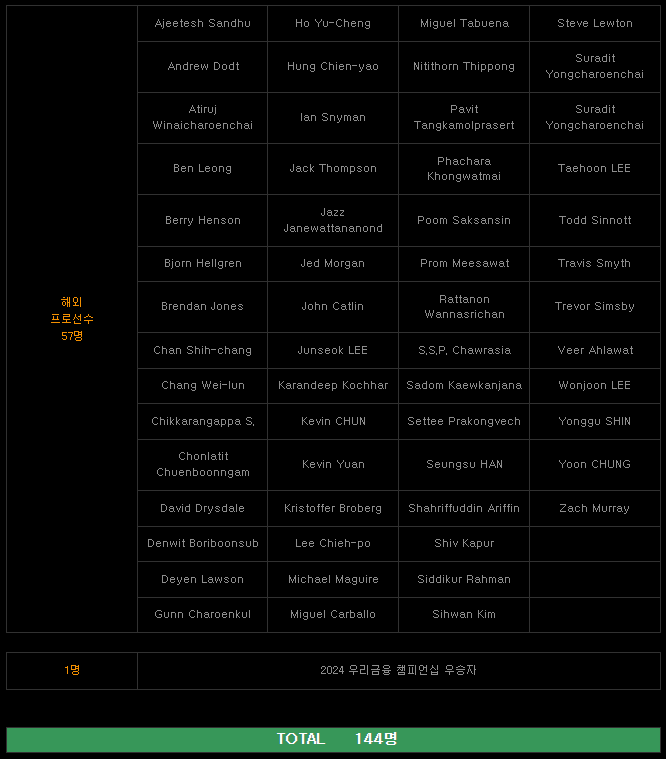 해외 프로선수 57명, 그리고 이번주에 개최되는 2024 우리금융 챔피언십 우승자까지 총 144명 입니다.
