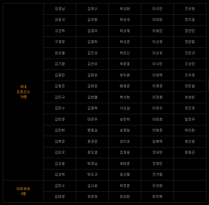 국내 프로선수 78명, 아마추어 8명,