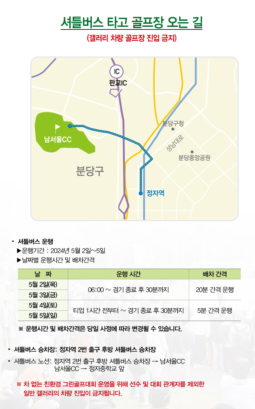 주말에는 티업 1시간 전부터 경기 종료 후 30분까지 운행하며, 5분 배차 간격 입니다.