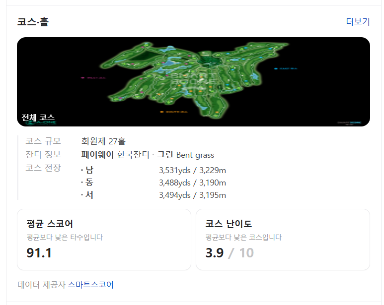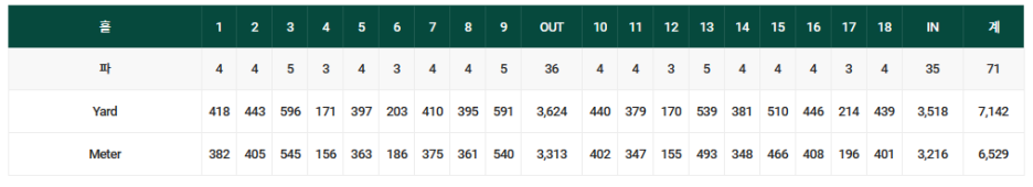 경기코스는 남코스와 서코스인데, 총 전장은 6,529 미터, 7,142 야드 입니다.