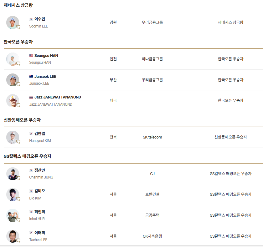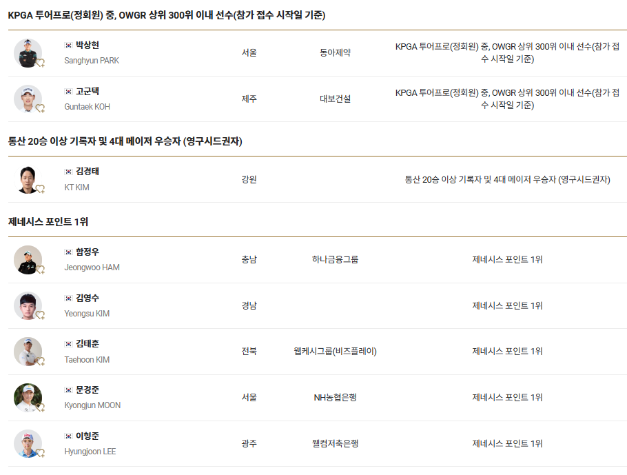 GS칼텍스 매경오픈 우승자 정찬민, 김비오, 허인회, 이태희 선수도 참가합니다.