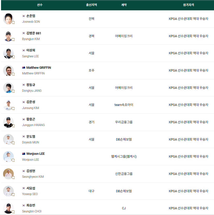 손준업, 김병준 881, 이상희, 매튜 그리핀 (Matthew Griffin), 장동규, 김준성, 황중곤, 문도엽, 이원준, 김성현, 서요섭, 최승빈 선수입니다.