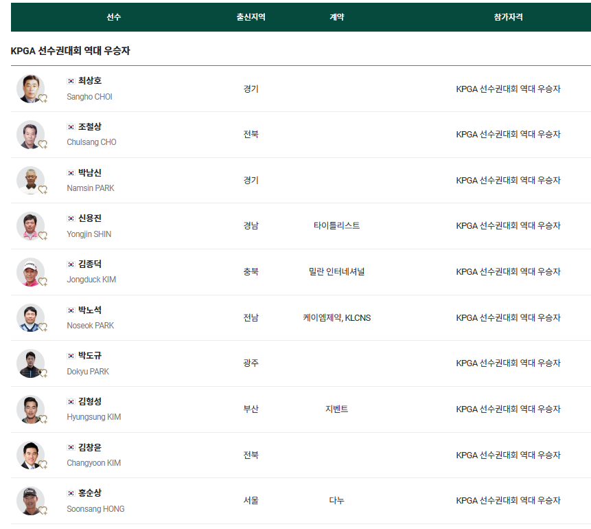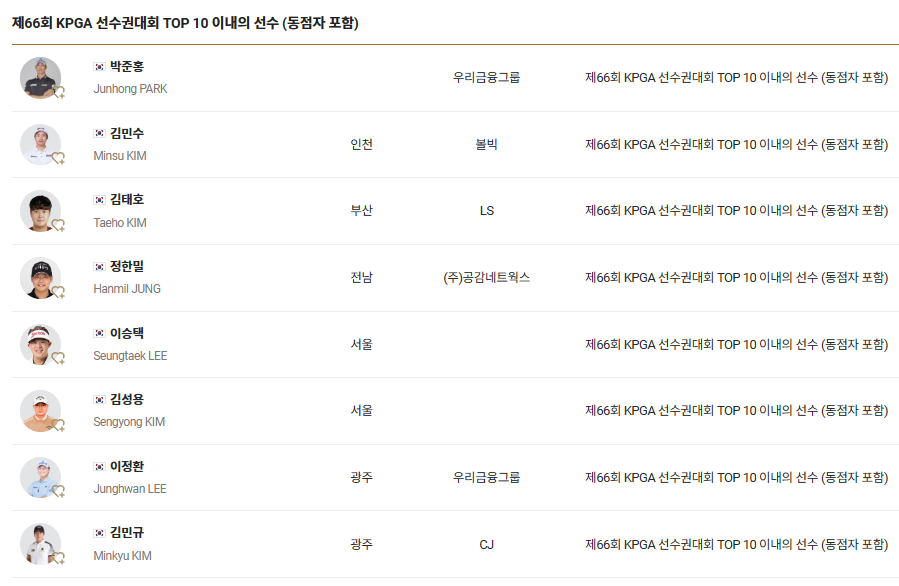직전 대회인 제66회KPGA 선수권대회 TOP 10 이내의 선수 자격으로 박준홍, 김민수, 김태호, 정한밀, 이승택, 김성용, 이정환, 김민규 선수