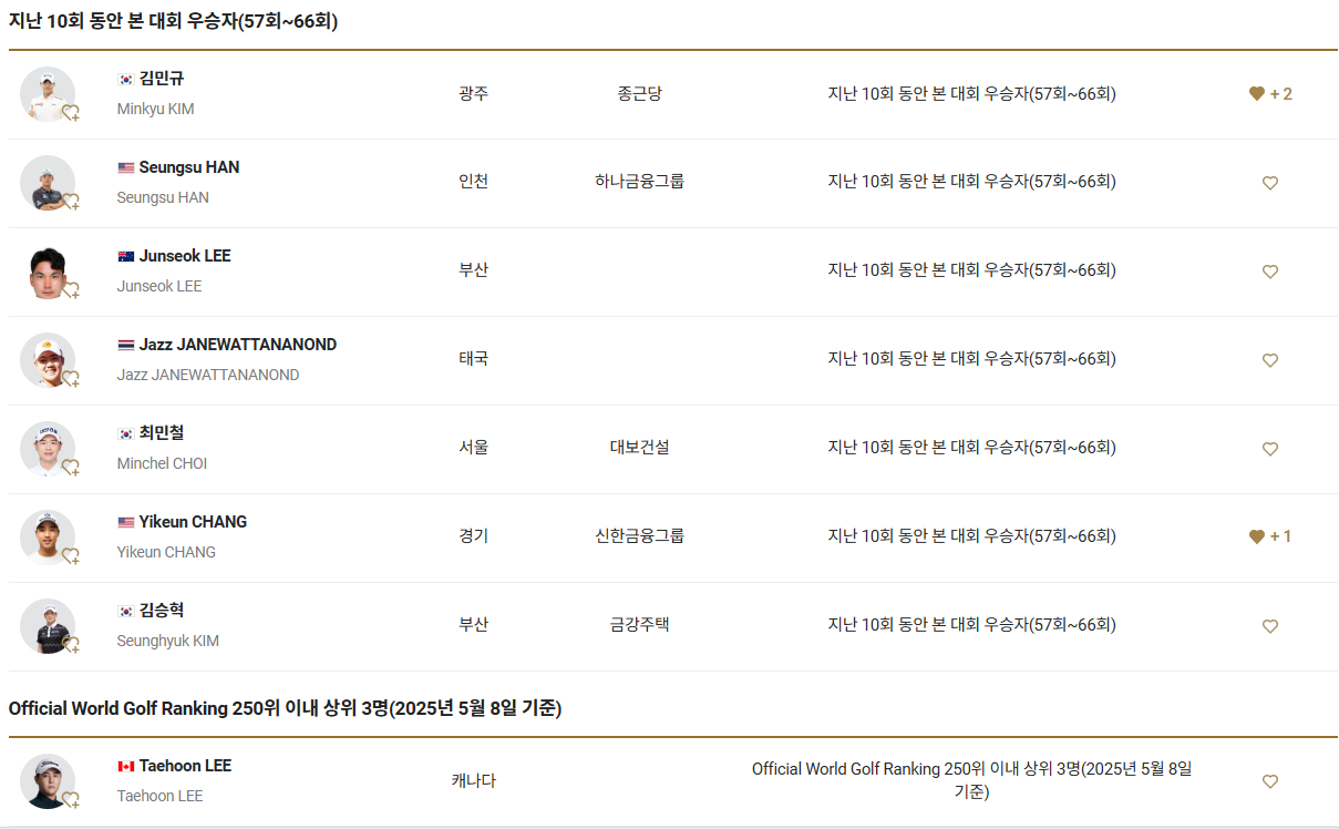그 외에도 지난 10회 동안 본 대회 우승자, Official World Golf Ranking 250위 이내 상위 3명,