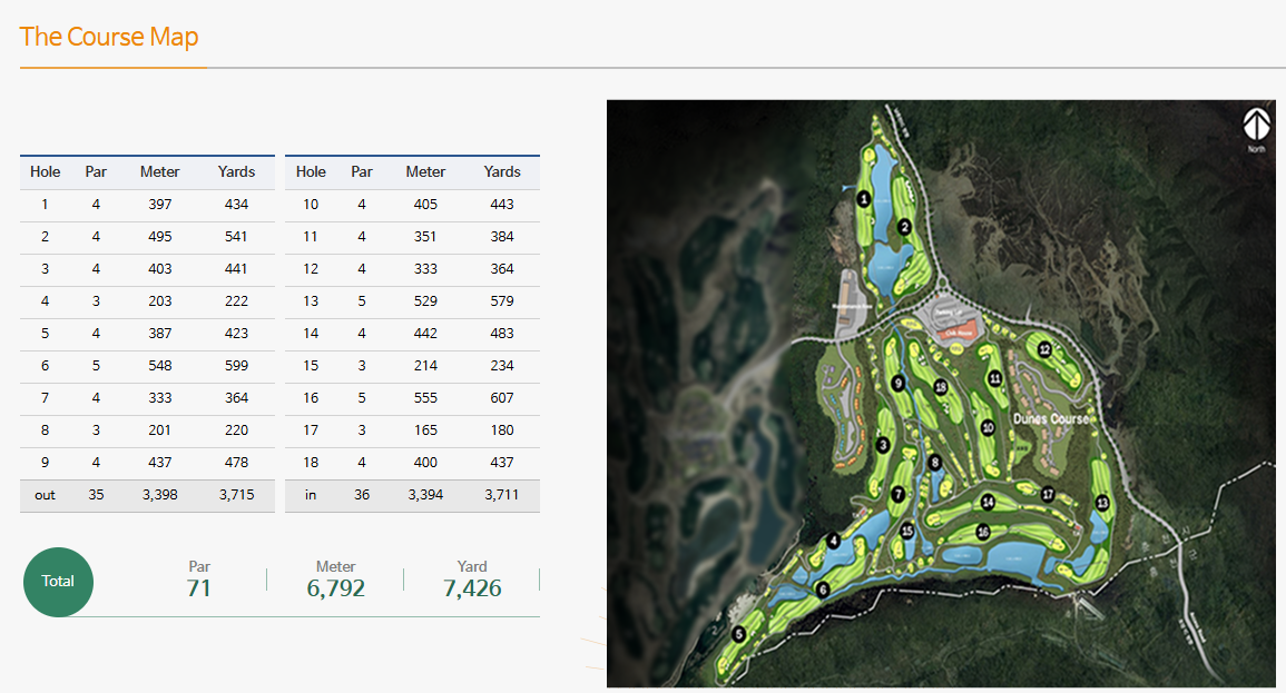 파71 코스로 총 전장은 7,426 야드, 6,792 미터 입니다.