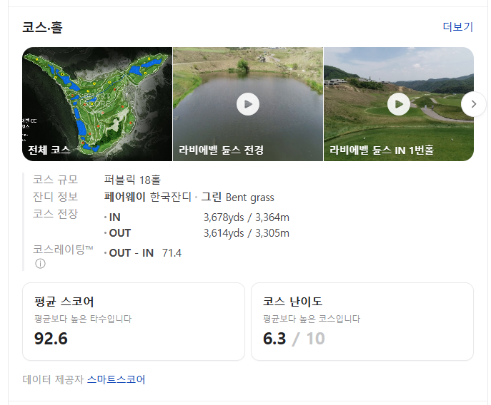 라비에벨 CC는스마트스코어 기준 평균스코어 92.6타로 평균보다 높은 타수이며, 코스 난이도도 6.3점으로 높은 편입니다.