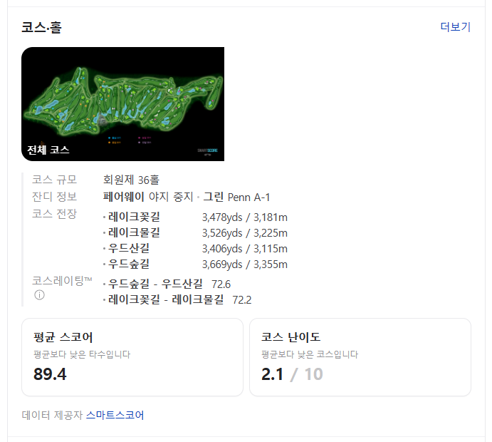 스마트스토어에서 확인한 평균 스코어는 89.4로 평균보다 낮고, 코스 난이도는 2.1점으로 평균보다 낮은 코스입니다.
