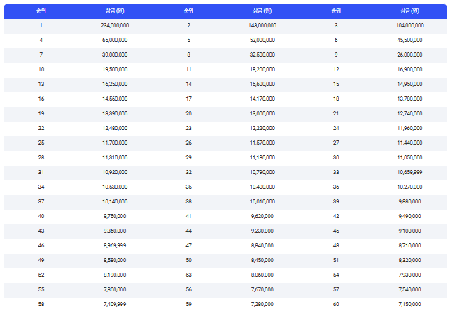 이번 대회에는 총 132명의 선수 중 60명에게 상금이 지급됩니다. 우승자는 2억 3천 4백만원이며, 60위 선수는 715만원 입니다.