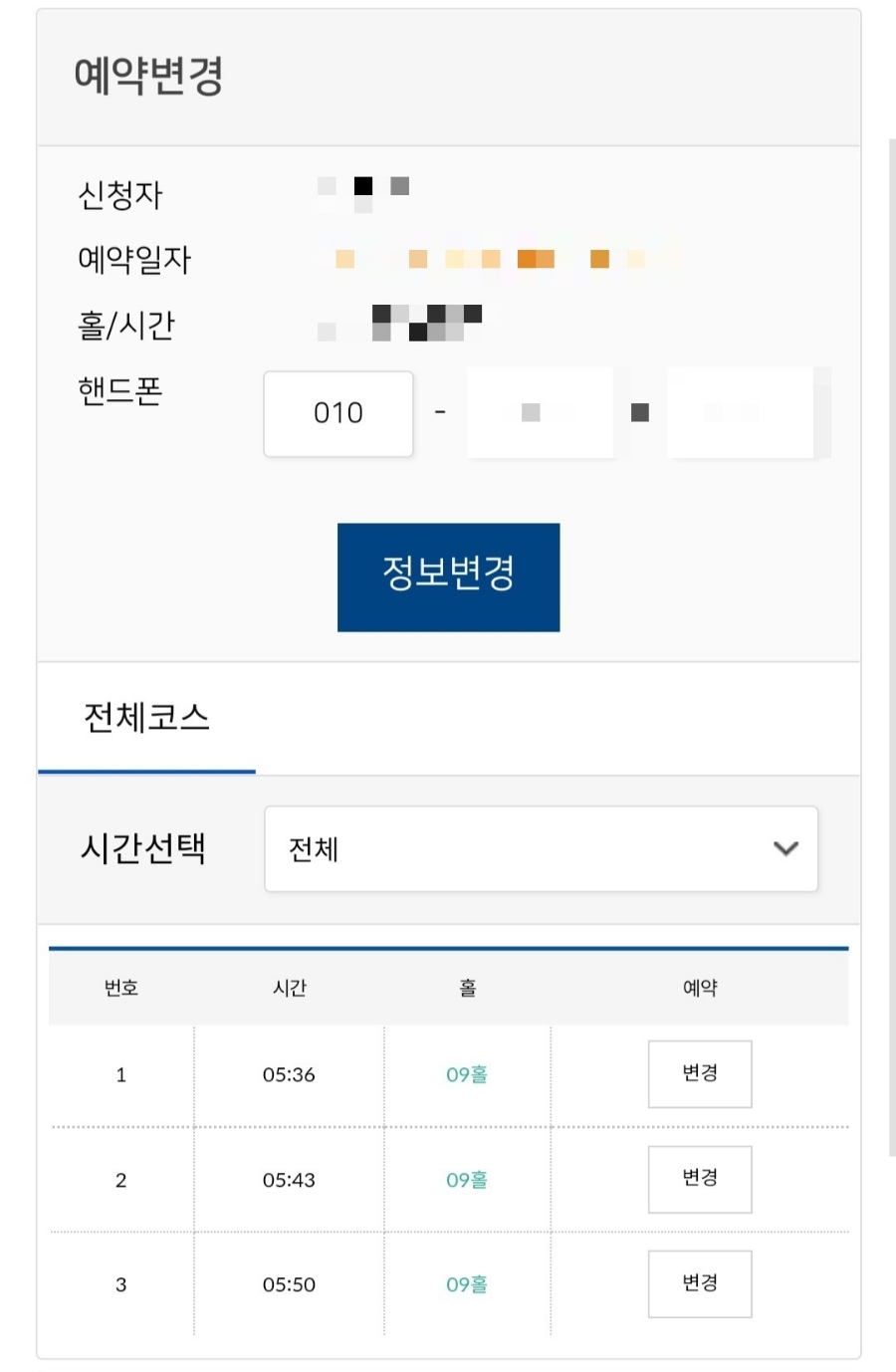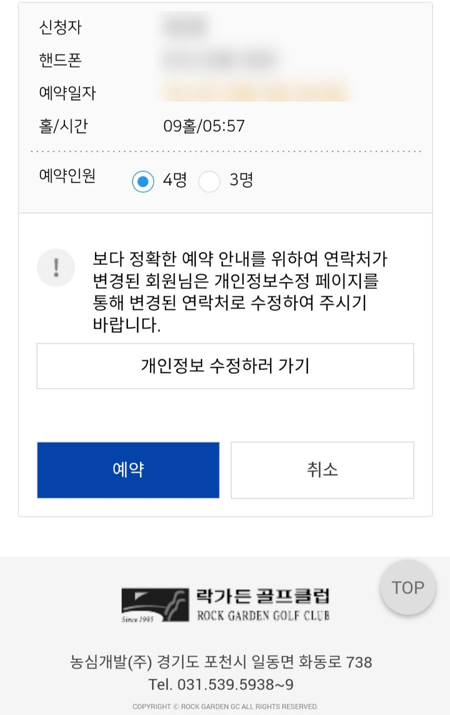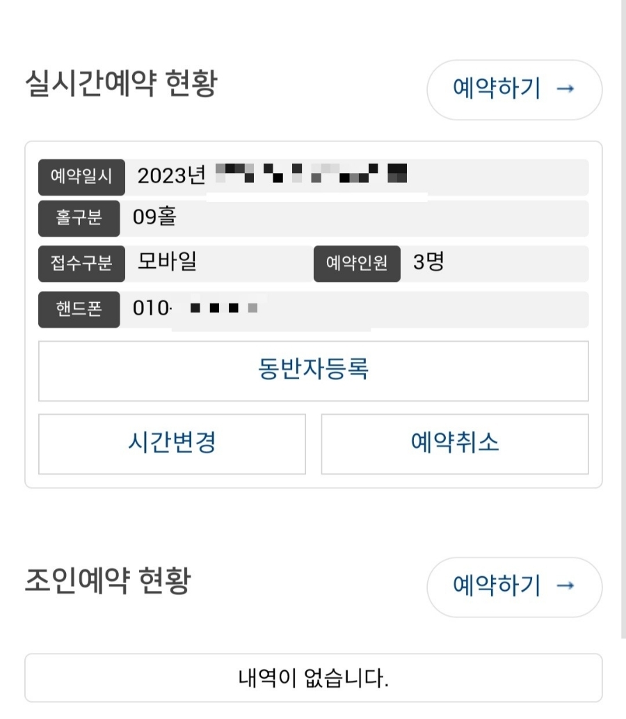 추가로 예약 확인/취소 창에서 동반자 등록이나 시간 변경 및 취소도 가능합니다.