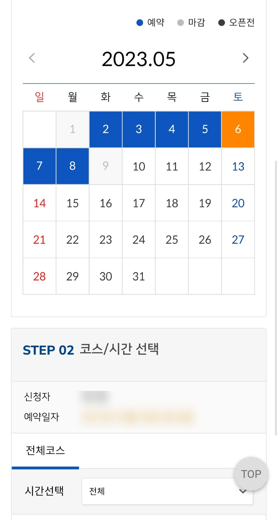 예약하려고 들어가서 파란색으로 된 예약 가능 날짜를 클릭합니다.